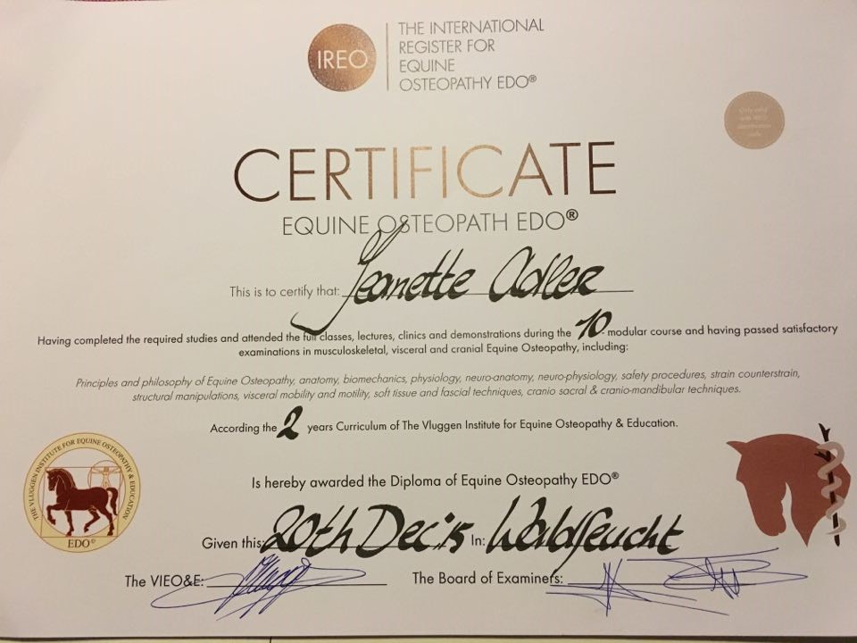 Jeg er certificeret af "The International register for Equine Osteopathy EDO" (IREO) og medlem af "Worldwide Alliance of Equine Osteopaths (WAEO)", begge arbejder på at sikre den højst mulige standard indenfor Osteopati til heste.